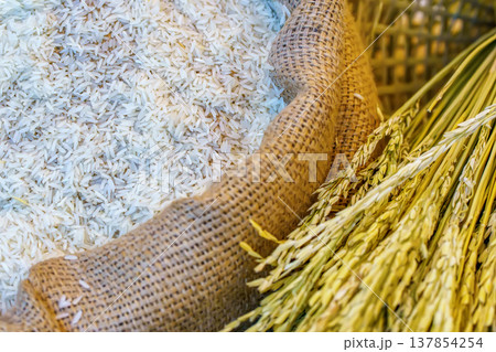 Top view of various types of corn kernels for making popcorn. Harvested corn kernels are sold in bags.