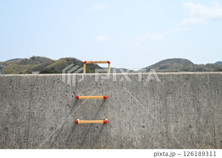 堤防と青い空と黄色いはしご