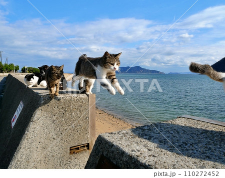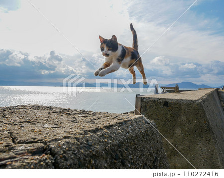 堤防をジャンプする猫(香川県仲多度郡多度津町佐柳島)