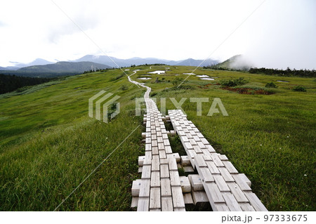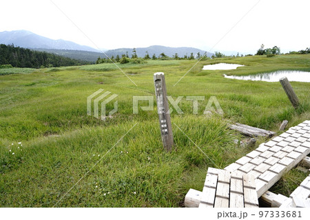 長野県秋山郷栄村の小赤沢登山口から登る苗場山 坪場の湿原の木造の踊り場 2022年8月29日