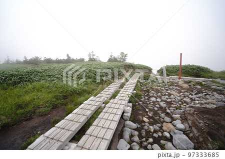 小赤沢登山口から登る苗場山 霧が舞う坪場付近の木造の踊り場 2022年8月29日