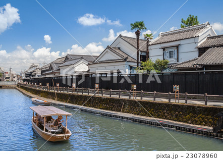 栃木市巴波川沿いの蔵が続く町並みを進む遊覧船