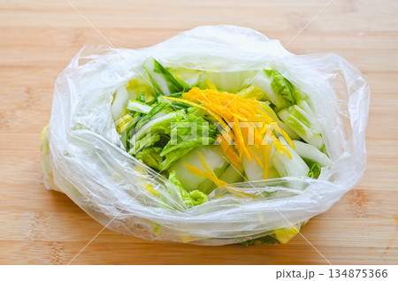 白菜の浅漬けに柚子と塩昆布を加える