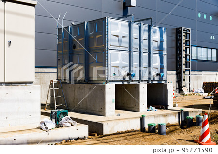 工場建設工事現場 給水設備ステンレス製パネルタンク設置