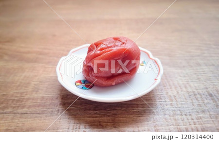 白い丸型の小皿に盛られた赤紫蘇と梅干しを白背景で撮影