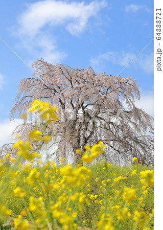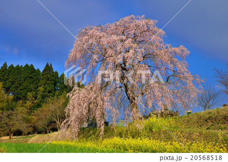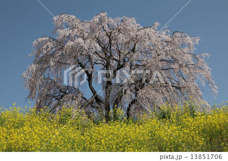 しだれ桜 大木から観た菜の花畑「観光名所:墓守桜」大分県竹田市宮城地区
