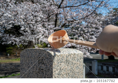 墓石に水をかける 桜が咲く墓地で墓参り