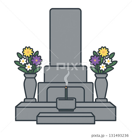 文字を刻んでいないお墓 仏花あり 墓石【手描き水彩画】白バック 透過背景 コピースペースあり