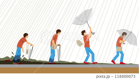 災害、豪雨。傘を差した歩行者と歩道にあふれた水の量のイメージイラスト