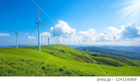 丘の上に立ち並ぶ風力発電のブレード エコロジーのイメージ