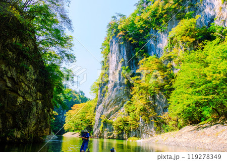 東北・猊鼻渓・舟下り・緩やかな流れの砂鉄川の舟から錦壁岩を眺めるイメージ・岩手県一関市(1)