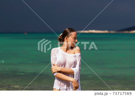 Woman in wet blouse standing in water