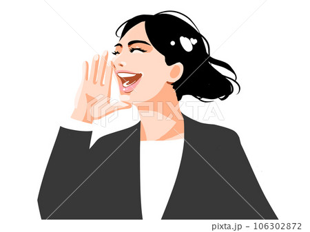 手を口に添えて呼びかけるバッグを脇に抱えたジャケットスタイルの女性イラスト
