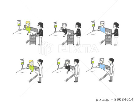 入院患者の患者に声をかける医者や看護師のセット コミカルな手書きの人物 ベクター、線画にカラー