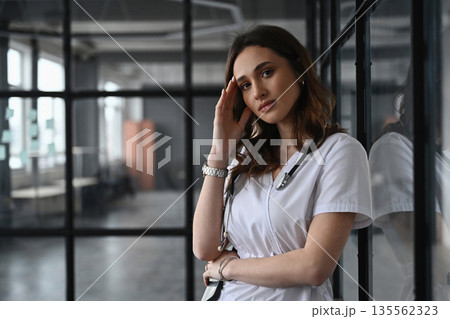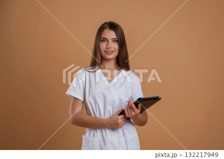 Pretty nurse is in white clothes. Young woman is against background in the studio