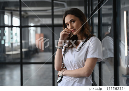 Professional stethoscope in hand. Female doctor in white coat is in the hall