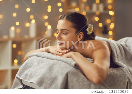 Young woman lying with closed eyes alone on massage couch in salon at wellness center.