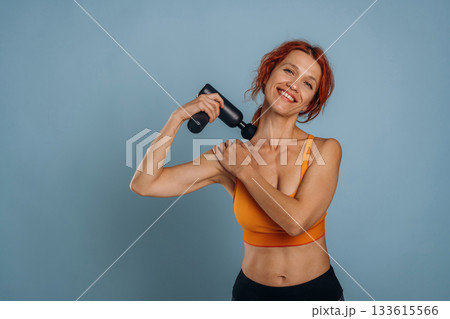 Fitness, sport conception. With automatic massager. Woman is in the studio against background