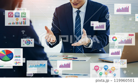 会議するビジネスパーソンのグループとビジネスデータ バナー・広告向け正方形ビジュアル
