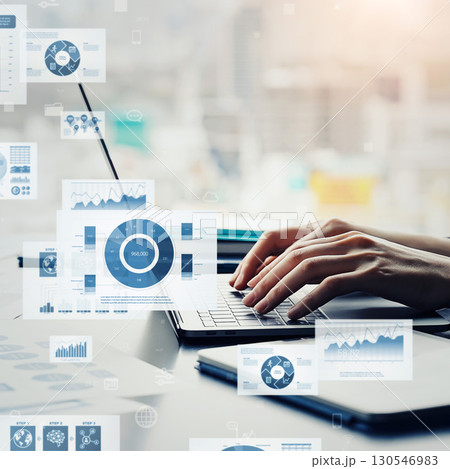 ノートパソコンを使うビジネスパーソンのグループとビジネスデータ バナー・広告向け正方形ビジュアル