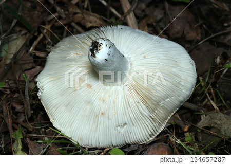 ベニタケ属カワリハツ茸のきれいな白い裏面カサヒダ&柄写真(自然下菌・キノコ類マクロ撮影)