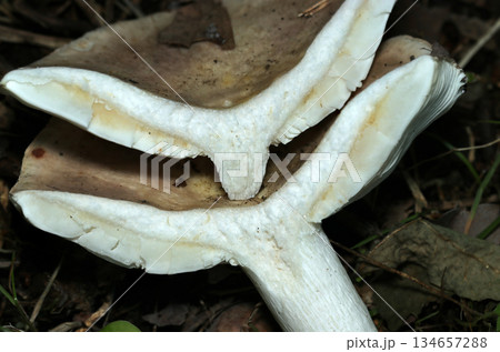 半分に割ったベニタケ属カワリハツ茸の白色内部断面写真(自然下菌・キノコ類マクロ撮影)