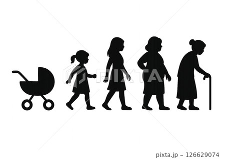 PNG black silhouette evolution of woman from baby stroller to old age isolated on transparent background. Concept of life stages, female aging process, generational development timeline illustration
