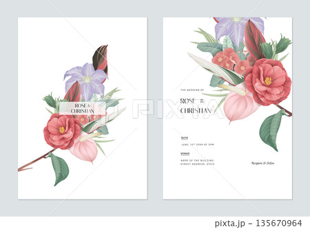 Floral wedding invitation card template design, Semi-double Camellia flowers with leaves in purple and pink tones
