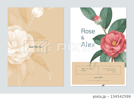 Floral wedding invitation card template design, white Semi-double Camellia flowers with leaves