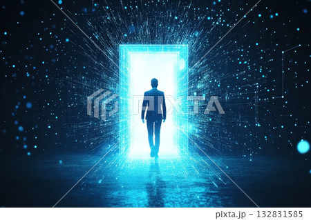 Businessperson Stepping Through Glowing Blue Portal to New Opportunities and Perspectives