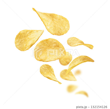 Potato chips levitate on a white background