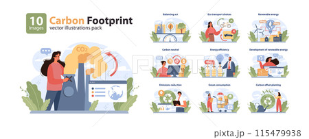 Carbon Footprint set. Visualizing personal impact on environment. Balancing natural resources, making eco-friendly transport choices, promoting energy efficiency. Flat vector illustration
