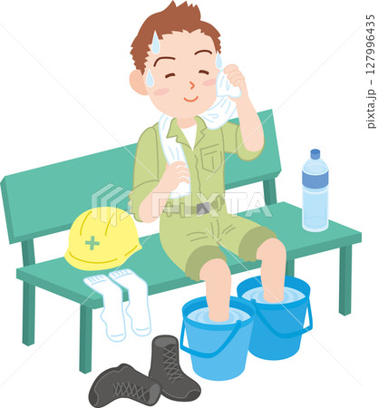 熱中症対策_休憩の取り方_足をバケツで冷やしながら汗を拭く作業着の男性のイラスト