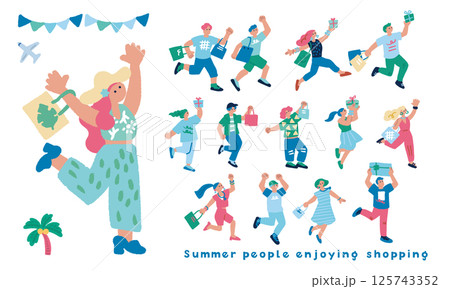 プレゼントやショッピングで喜ぶ人々の手書きのイラストセット