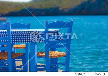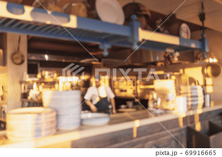 Seafront mediterranean cafe kitchen brightly lit by setting sun. Defocused background.