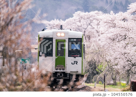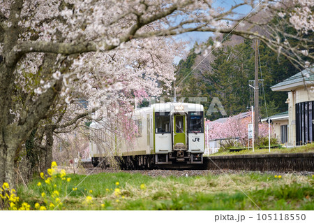 桜が満開の磐越東線夏井駅に止まるキハ110の列車