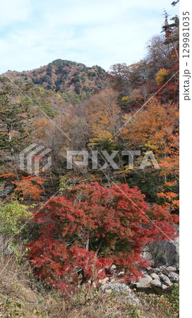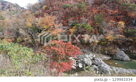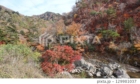 渓谷の岸辺で清流と河原を覆うように茂り日に当たる紅葉した木々