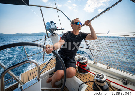Man at the helm of a sailing yacht near Croatia, steering the boat through open water. Leadership, control, sailing lifestyle and freedom at sea.