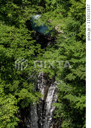 雪解け水で水量が多い日本のナイアガラの滝と吊り橋