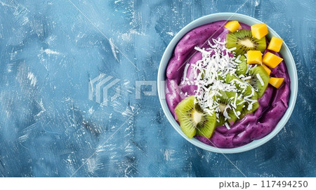 トロピカルスアサイーボウルとシンプルな背景とコピースペース