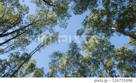 View of Tall Trees Reaching Towards a Clear Blue Sky in a Serene Forest During Daylight Hours, Showcasing Nature's Beauty and Tranquility