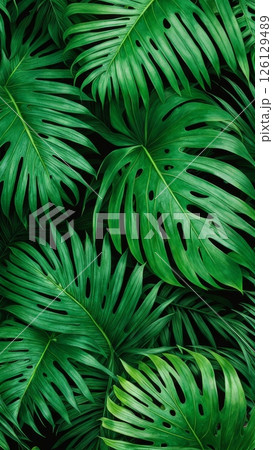 Tropical monstera leaves close-up with lush green foliage. Exotic jungle background with natural plant texture
