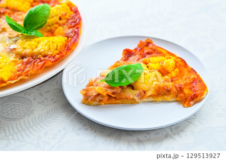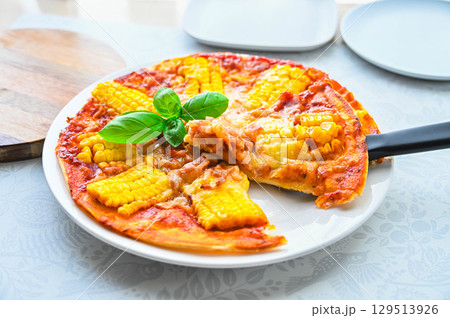 Vegetarian pizza with arugula, eggplant, mushrooms and corn
