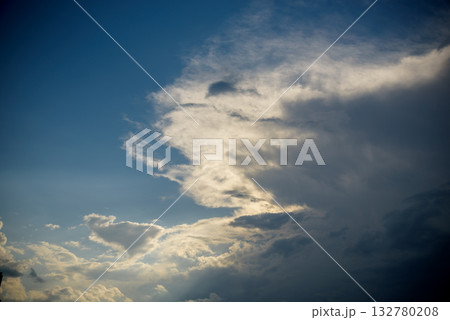 beautiful blue sky and white fluffy group of clouds with sunrise in the morning, natural background