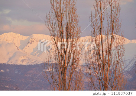早春の美瑛新栄の丘から見る十勝岳連峰