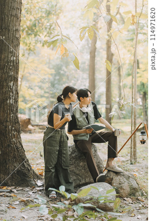 Asian couple sweet in tent inside on they camping trip, traveller relax and sleep togather in out door and camping trip