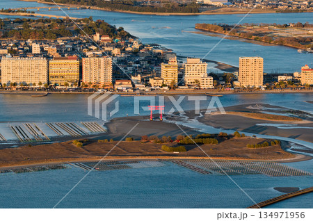 干潮に現れる朱の鳥居 ― 浜名湖・弁天島神社の空撮風景