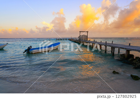 Sunset paradise evening light in ocean with ocean wave and shadow clouds