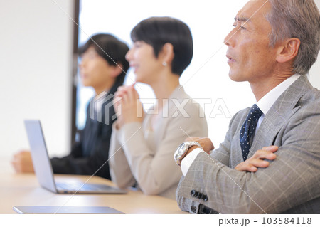 若いビジネスパーソンに混じってセミナーを受ける中高年男性_1