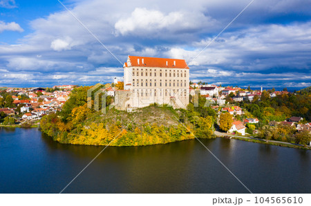 Konopiste medieval castle and Konopistsky water reservoir. Benesov, Czech Republic. Aerial view from drone.